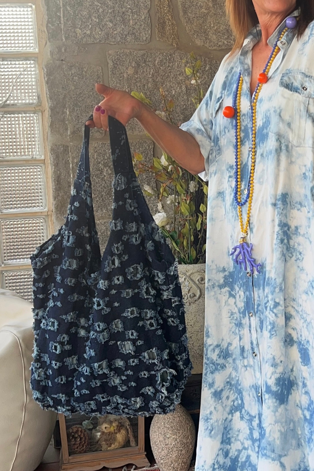 Saco com 2 alsas em ganga, forrado, com bolso no interior, e a fechar com mola
